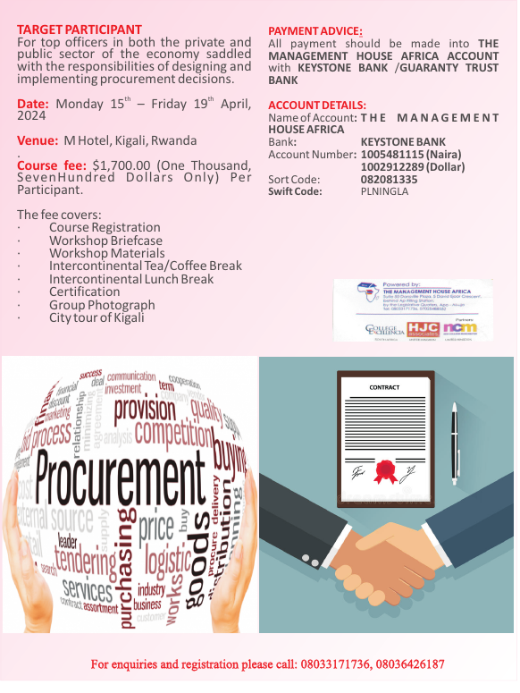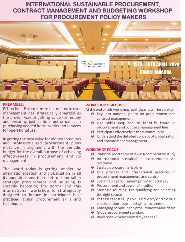 International Sustainable Procurement, Contract Management and Budgeting Workshop for Procurement Policy Makers -April 2024 International WorkShop Leave a Comment on International Sustainable Procurement, Contract Management and Budgeting Workshop for Procurement Policy Makers -April 2024 Register Now How useful was this post? Click on a star to rate it! Submit Rating Average rating 0 / 5. Vote count: 0 No votes so far! Be the first to rate this post.